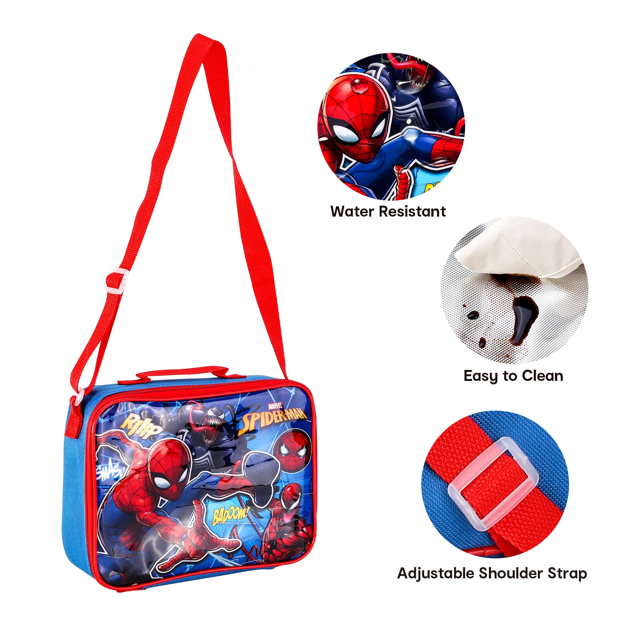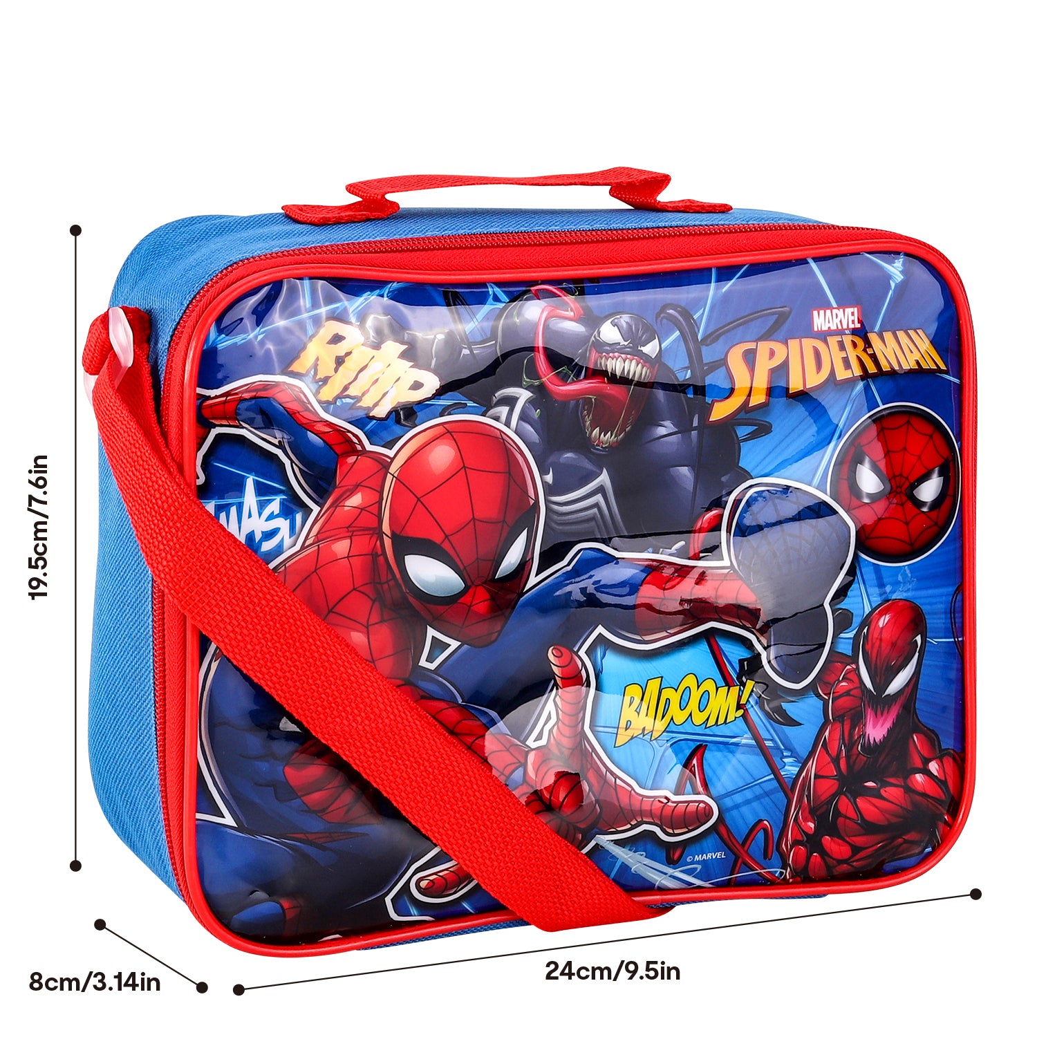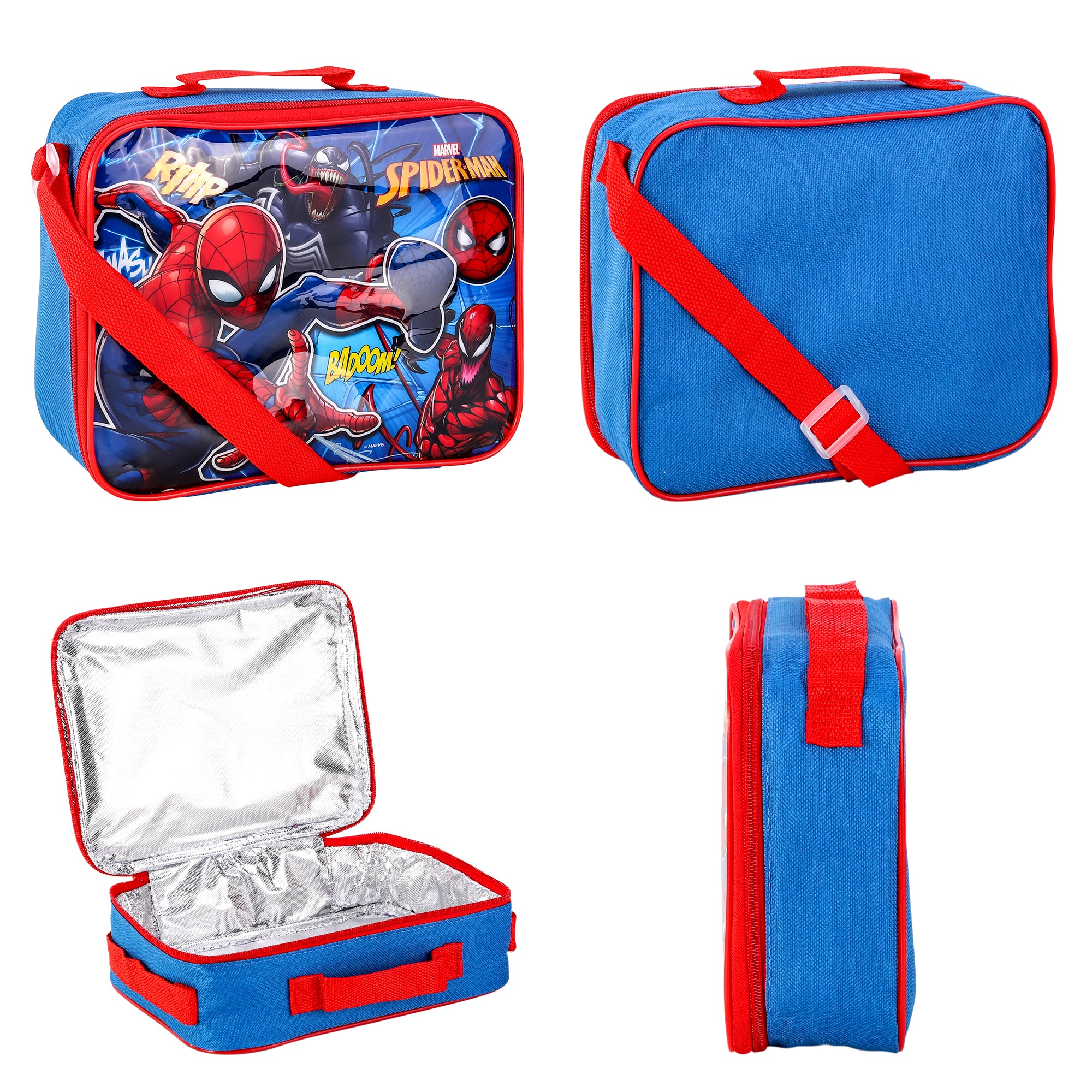 Keep your lunch cool and spidey-senses tingling with this insulated lunch bag featuring Spiderman, Carnage, and Venom. Perfect for any superhero fan on-the-go, this bag will make lunchtime a villain-crushing adventure!